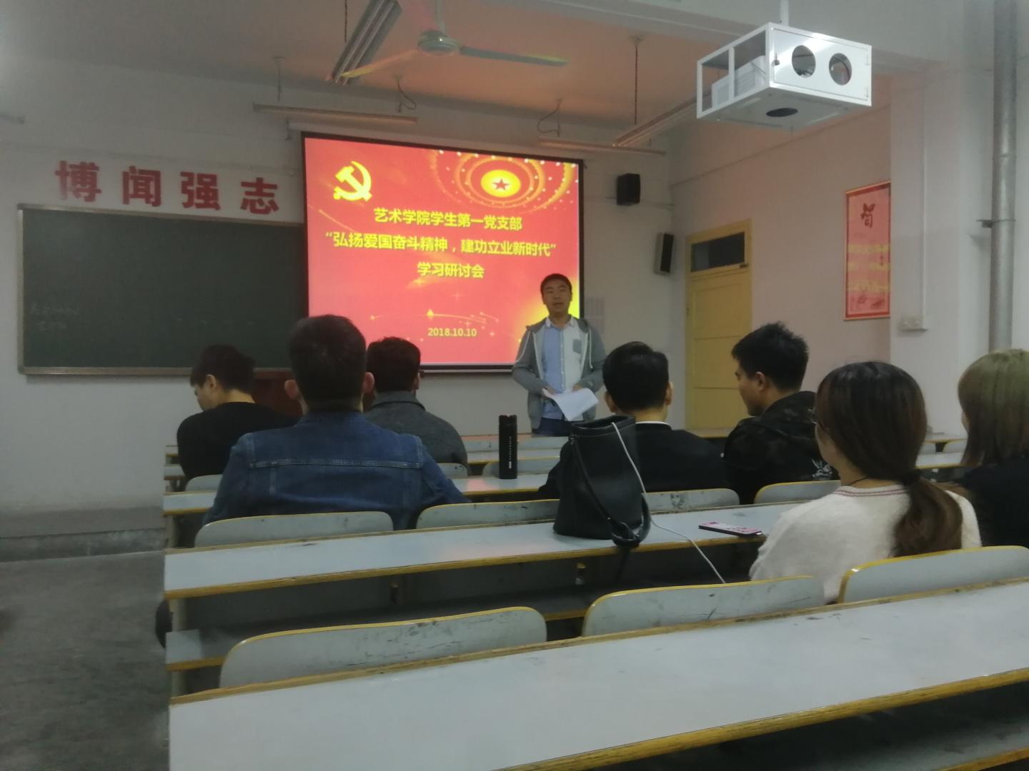 为深入学习习近平总书记对弘扬爱国奋斗精神作出的重要指示,认真贯彻落实学校专题会议精神,10月10日晚,艺术学院学生第一党支部在604教室召开了“弘扬爱国奋斗精神,建功立业新时代”学习研讨会,会议由支部书记刘钰老师主持,全体支部委员及党员参会。